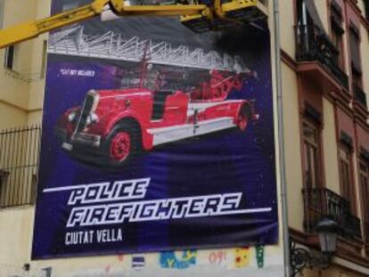 Luis Montolío cuelga una de sus enormes fotos junto al nuevo retén del Carmen dentro del festival Intramurs.