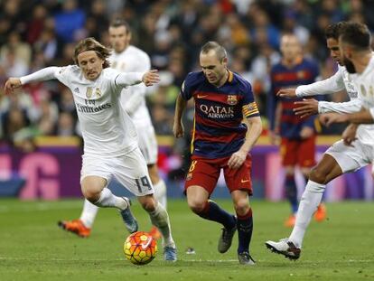 El contraste entre la alegría de los jugadores del Barça y la frustración y desánimo de los del Madrid que encajaron cuatro goles en su estadio