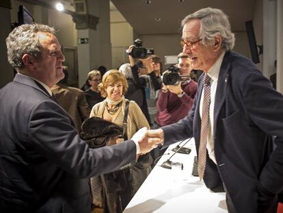 El italiano y Lorenzo se estrechan la mano en la presentación del equipo Yamaha en Barcelona, pero Márquez no sale airoso de las críticas del bicampeón
