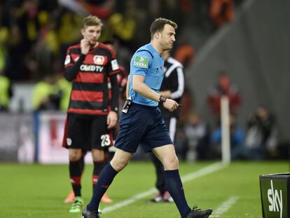 El colegiado suspende durante 10 minutos el partido, tras la negativa del entrenador del Leverkusen de retirarse del terreno después de ser expulsado