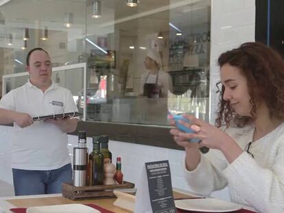 Rubén trabaja de auxiliar de sala en 'Kilómetros de Pizza', un restaurante en Las Tablas, Madrid. La Fundación Síndrome de Down Madrid se preocupa por encontrar trabajo a aquéllos con un cromosoma de más