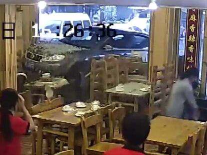 Un error de una conductora provoca que se estrelle contra un cristal, tras el que cenan varias personas