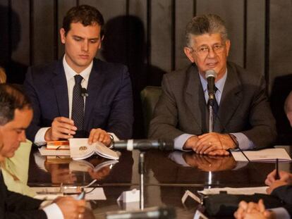 El discurso del líder de Ciudadanos en la Asamblea divide a chavistas y opositores, que preguntan por la financiación de Podemos