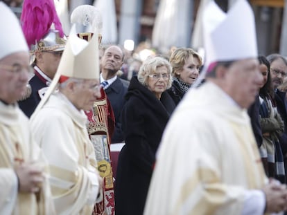 La alcaldesa de Madrid, Manuela Carmena, renueva en la Plaza Mayor el tradicional Voto de la Villa frente la Virgen de la Almudena, que, según la tradición, fue quien salvó a la capital de unas graves inundaciones que padecieron los madrileños en 1646