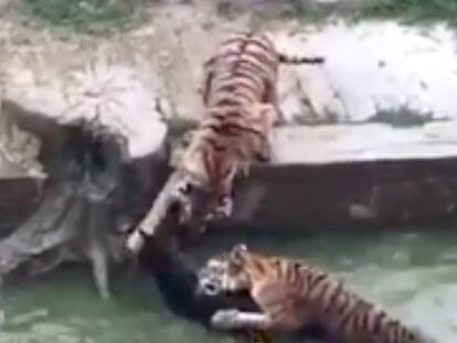 Los cuidadores del centro lanzaron al equino al agua donde se encontraban los felinos