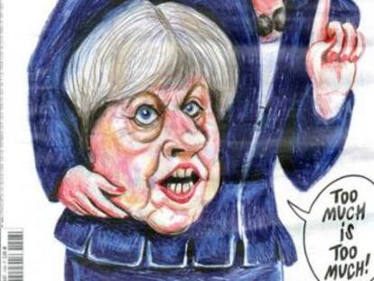 Una vinyeta a l’interior de la revista representa persones terroritzades corrent al costat del Big Ben sota l’epígraf “Els consells del Daesh per aprimar-se”