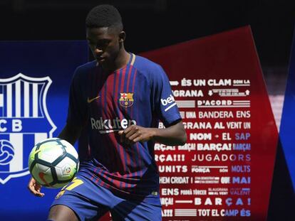 El Barcelona presenta al extremo francés por el que pagó 105 millones fijos, más 42 en variables, al Borussia Dortmund