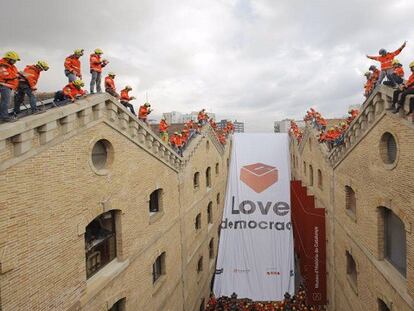 Miembros de la sectorial Bomberos por la independencia cuelgan una pancarta con el lema 'Love democracy'