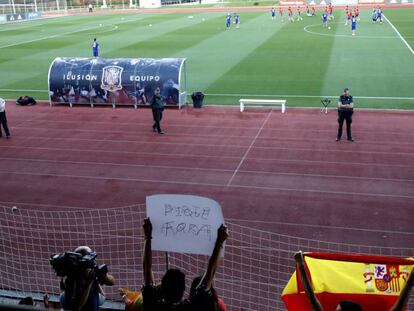 La selección se entrena en Las Rozas ante una muchedumbre de hinchas enfadados, dirigidos por los cánticos de un grupo ultra contra el jugador del Barça, que protesta por las cargas policiales en Cataluña