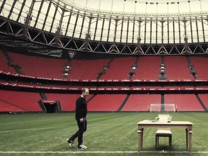 David Safier, invitado por la Fundación Athletic para promocionar su última novela en Bilbao, mecanografía en el césped de La Catedral su cuento ‘Replay’