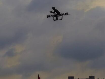 Un inventor chino, inspirado en dibujos animados de sus primeros años, crea una moto voladora y sobrevuela Dongguan como hizo Elliot en su bici con E.T.