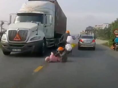Cayeron de la moto en la que viajaban tras recibir el impacto lateral de un coche y se deslizaron hasta el límite del carril del sentido contrario