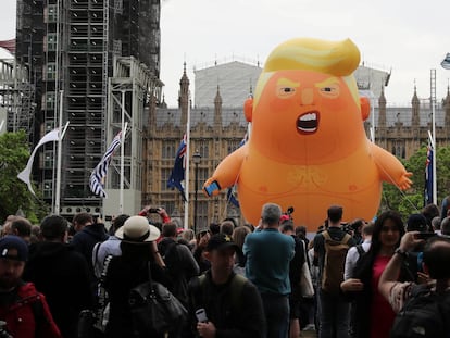 La nueva versión del Baby Trump , el globo gigante que se burla del presidente de EE UU, comenzó este martes a circular por Londres como parte de las protestas previstas contra la visita de Estado del mandatario republicano