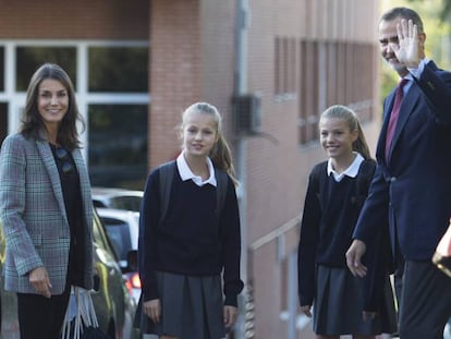 Los Reyes han acompañado a sus dos hijas en su primer día de colegio, al que han llegado en un coche conducido por Felipe VI. Leonor y Sofía, vestidas con el uniforme escolar, comienzan tercero y primero de Educación Secundaria Obligatoria, respectivamente