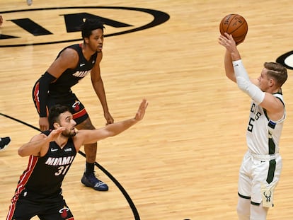 Antetokounmpo fue el único de los 13 jugadores de Milwaukee que no logró ningún acierto desde la máxima distancia (97-144)