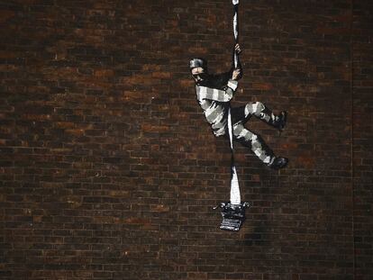 La obra muestra un reo bajando por un muro de la cárcel de Reading hacia una máquina de escribir