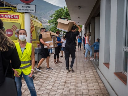Los vecinos evacuados de los pueblos que se encuentra la lava a su paso acuden a un polideportivo a recoger comida y ropa, sin saber qué ha sido de sus hogares ni cuándo podrán regresar