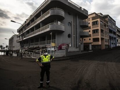 El entorno del cono ofrece una visión apocalíptica de la isla con casas y viñedos cubiertos de una enorme capa gris, centros turísticos desolados e invernaderos derrumbados