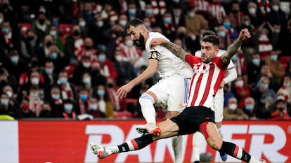 El equipo de Ancelotti doblega a un bravo Athletic tras un duelo frenético y equilibrado marcado por el fulgurante despegue del delantero francés, aplaudido por San Mamés