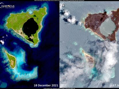 Un modelado 3D digital muestra la caldera volcánica de cinco kilómetros de diámetro que se encuentra en el sur del Pacífico