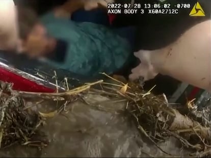 La policía estatal grabó el momento en el que un equipo auxilia a una víctima de las inundaciones recientes en el Estado