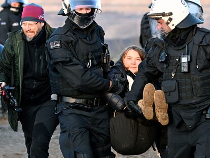 La policía saca en volandas a la joven junto con un grupo de manifestantes que se había acercado demasiado a la zona