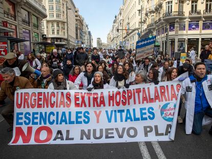 Al menos 700 médicos de todos los sectores, según cifras de la Delegación del Gobierno, han recorrido el centro de la capital contra las políticas sanitarias de la Comunidad de Madrid