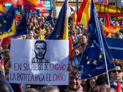 “Pedro Sánchez, dictador” o “España no se vende” son algunos de los lemas que se han escuchado en las concentraciones convocadas por el Partido Popular contra la amnistía