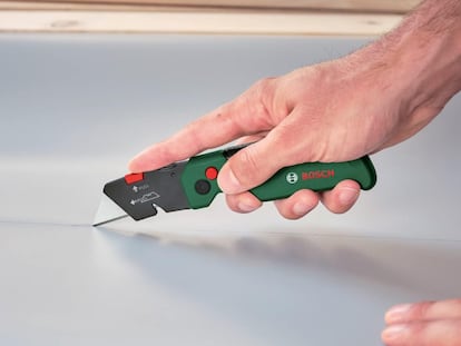 Este cúter profesional, con seguro y agarre ergonómico, se puede plegar con tan solo una mano e incluye tres cuchillas de recambio alojadas en su empuñadura