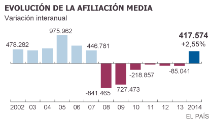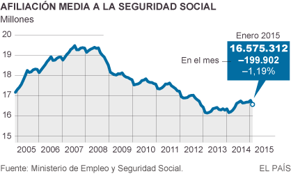 La afiliación crece un 2,8% respecto a 2014, el avance más intenso en siete años. El paro registrado se anota la mayor caída mensual desde 2001, con 13.538 desempleados menos que en enero