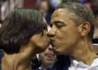 El presidente besa a su mujer frente al público de un partido de baloncesto entre las selecciones de EE UU y Brasil