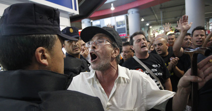Un trabajador del ferrocarril se encara a los policías en la estación de Atocha. / ÁLVARO GARCÍA