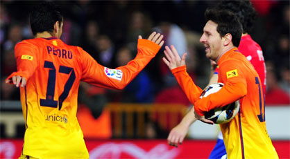 Los goles del argentino, frente al desacierto del chileno, decantan a favor del Barça el duelo contra el Granada (1-2)