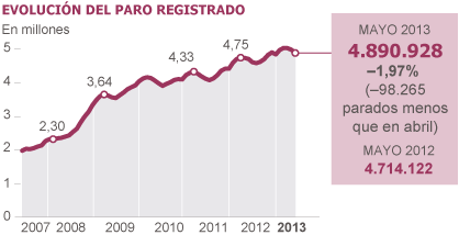 El número de desempleados desciende hasta los 4,89 millones, en un mes tradicionalmente bueno. La cifra de afiliados a la Seguridad Social crece en 134.660 respecto a abril