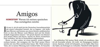 El escritor, reportero de 'Der Spiegel' y ex del 'Süddeutsche Zeitung' Juan Moreno ha decidido no seguir siendo español. Entregará su pasaporte. Asqueado. Porque España "tiene los políticos que se merece": “Ganan comicios contratando grupos famosos para la verbena....” Dice que en el país del que emigró “hasta los conventos pagan en negro al jardinero". Una mirada de fuera adentro. Un "ahí te quedas".