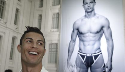 Una imagen de 15 metros del futbolista en calzoncillos ha sido instalada en el Ayuntamiento. El portugués se ha fotografiado junto al cartel, de un evento de su línea de ropa interior. Por C. HERTRAMPF