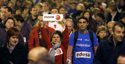 PROTESTAS EN MONDRAGÓN. Trabajadores de Fagor se manifestaban este jueves en la localidad guipuzcoana por la crisis de la cooperativa. / J. Hernández
