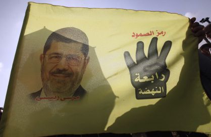 Morsi, de oscuro, habla con compañeros de la cofradía. / REUTERS-LIVE!