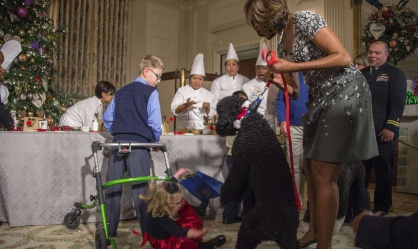 Todos los movimientos de los famosos, en fotos... En la imagen, Michelle Obama controla a su perra Sunny, que tiró al suelo a una pequeña visitante de la Casa Blanca durante la exhibición de los adornos navideños