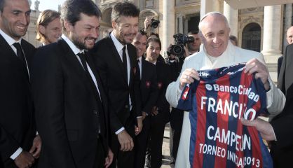 Todos los movimientos de los famosos, en fotos... En la imagen, el papa Francisco recibe una camiseta de su equipo de fútbol, el argentino San Lorenzo de Almagro, que le entregaron sus jugadores en el Vaticano