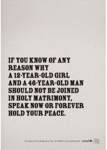 "Si conoces alguna razón por la cual una niña de 12 años y un adulto de 46 años no puedan unirse en santo matrimonio, habla ahora o calla para siempre". Campaña contra el matrimonio infantil