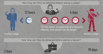 Cada día el ejército de Israel arresta una media de 2 niños palestinos de entre 12 y 17 años. 7000 niños palestinos han sido arrestados por las fuerzas israelíes en los últimos 10 años. Tirar piedras a vehículos militares, el delito más generalizado