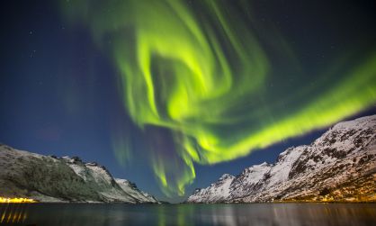 Hielo, nieve y espectaculares auroras boreales marcan el paisaje invernal de Tromsø, al norte de Noruega.