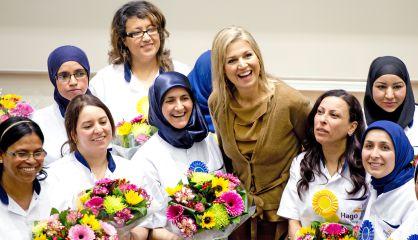 Todos los movimientos de los famosos, en fotos. En la imagen, Máxima de Holanda posa con un grupo de mujeres en el Hospital Erasmus MC en Rotterdam durante la ceremonia de graduación de mujeres extranjeras del servicio de limpieza que han obtenido el certificado del idioma holandés.