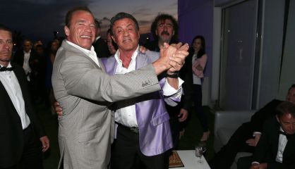 Todos los movimientos de los famosos, en fotos. En la imagen, Arnold Schwarzenegger y Sylvester Stallone celebran en Cannes el estreno de 'Los mercenarios 3'