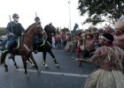 Demonstrators in Brasilia use bows and arrows to defend themselves against police tear gas and rubber bullets