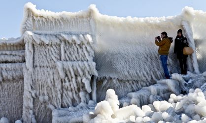 El fuerte viento y las bajas temperaturas de los últimos días han cubierto de una gruesa capa de hielo los alrededores del embalse de Navacerrada, en Madrid