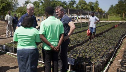 El actor y el expresidente de EE UU visitan la isla para comprobar cómo marcha la recuperación del país después del terremoto de 2010