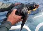 Authorities considering sending down a deep-sea robot to examine sunken vessel. Civil guards have rescued an endangered turtle from the area covered in oil
