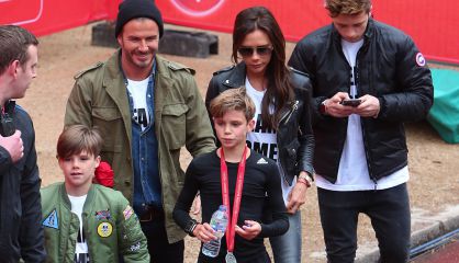 En la imagen, David y Victoria Beckham, con su hijo Romeo, que corrió el maratón de Londres el pasado fin de semana. Toda la familia se vistió con camisetas para apoyar al pequeño campeón.